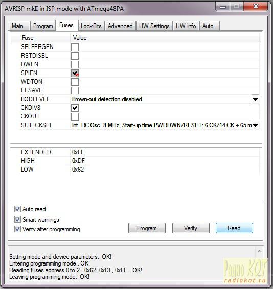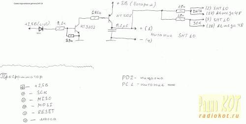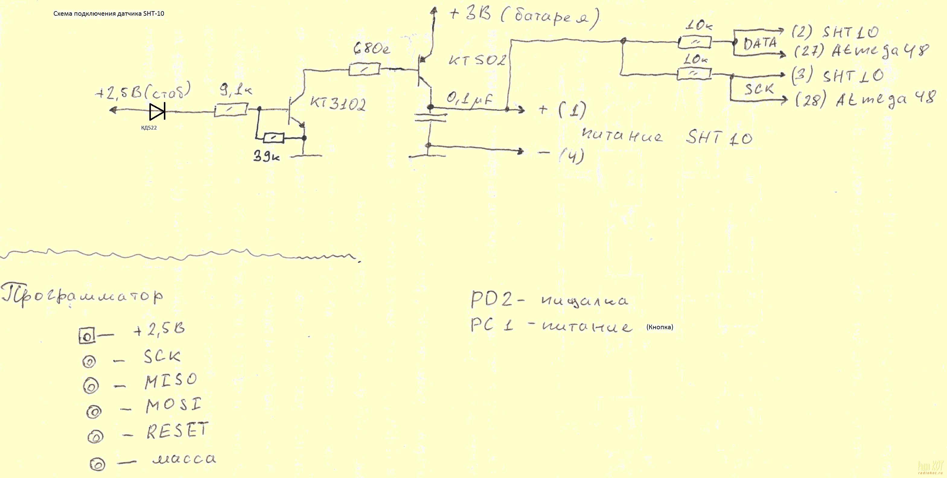 Автор: DaemoNN, dimbr19@gmail.com Целью сих изысканий было создание термометра с функцией измерения относительной влажности для проверки качества работы систем кондиционирования воздуха в салонах автомобилей. В итоге получилось небольшое симпатичное устройство, которое может пригодиться не только мастерам-холодильщикам, но и простым смертным в быту (ну мало ли зачем: кто-то, например, дневник природы ведет). Конструкция не претендует на какую либо оригинальность — думаю что на просторах интернета да и на этом сайте найдется не одна похожая схема, однако её основное достоинство — то что за её основу взято то что давно уже должно было оказаться в мусорном баке — отслуживший свой век алкотестер. Подобные штуки наверняка валяются у многих водителей в хламных углах — когда-то после серьезного ужесточения наказаний за пьяную езду они были очень популярны. Таким образом цена устройства определяется стоимостью датчика температуры и влажности, учитывая конечно кризис он недешевый (хотя сейчас уже вроде китайские аналоги появились, а поскольку код программы устройства я выкладываю на всеобщее обозрение, адаптировать её под «китайца» не составит особого труда, скорее всего), но по сравнению со стоимостью аналогичного готово приборчика хатой фирмы (а он еще до кризиса стоил в районе 5000р. в магазине холодильного оборудования, причем по параметрам он ничуть не выигрывает у нашего) стоимость получившегося устройства копеечная. Да и времени на сборку нужно совсем немного. Технические параметры прибора определяютя параметрами датчика SHT-10, примененного в нем. Срок службы алкотестера невелик по той простой причине, что химико-электрический датчик паров спирта приборчика живет весьма недолго (по крайней мере если нечасто пользоваться, может его надо «подкармливать» этими самыми парами время от времени:) ). Тем не менее у меня накопилось их за жизнь 3 штуки — один я покупал сам, еще два появились каким то другим образом — отдали добрые люди скорее всего для пополнения гаражной свалки. На поверку все 3 оказались «дохлыми» - никаких промилей они не показывали, даже когда были эксперименты с проспиртованными ватками, однако приборчики пищали, показывали нули — т. е. индикатор и процессор были явно живы. Тут естественно появилась идея которая появится даже у мальчишки-дошкольника — посмотреть что внутри. В одном приборчике оказалась микросхема в виде «кляксы» - этому дорога скорее всего в помойку, а вот еще два (хотя и были в разных корпусах) оказались собраны на базе микроконтроллера Atmega48 по одинаковой схеме. Их то и было решено использовать для опытов. Итак алкотестер ALCO-STOP преображенный в термометр: Это чудо китайской электроники состоит из МК Atmega 48, ЖКИ индикатора, подключенного напрямую к выводам микроконтроллера, микросхемы линейного стабилизатора напряжения на 2.5Вольта с выводом выключения, пищалки с драйвером на одном транзисторе (пищалка без генератора), кнопки включения, всякой мелочевки типа кондявок по питанию, датчика паров спирта и его обвязки (выход датчика был подключен к одному из входов АЦП микроконтроллера). Собственно этот дохлый датчик нам не нужен — выпаивается и выкидывается в мусюрное ведро, также там есть да резистора — датчик напряжения батареи он нам тоже не понадобится. При нажатии на кнопку включения через диодную раз