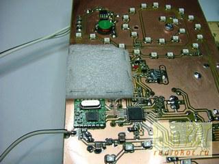 Сам запрос: GET /test/temper_feo.txt HTTP/1.1 На запрос сервер отвечает HTTP 200 OK 16.5;21;17:43 21-09-2014 Содержимое текстового файла следует после заголовка через 2 знака переноса строки. Знак переноса строки –это 2 байта: h0d,h0a. Алгоритм выделения данных примерно такой. Если сервер на запрос ответил HTTP 200 OK (запрашиваемый файл существует), программа начинает искать в теле ответа 2 последовательных знака переноса –h0d, h0a, h0d, h0a. (подпрограмма recive в закладке Wiz_PP). Если переносы найдены, то за ними идут нужные нам данные. Далее ищем знак «;». Всё что до него- это температура воды, после него и до пробела- это температура воздуха. Т.к. нас не интересует температура воздуха, мы её не «выделяем». После определения температуры воды, ищем знак пробела. Следующее за ним- это время и дата обновления. Всё это делается в подпрограмме test (закладка wiz_PP). В результате интересующие нас данные разложены по полочкам. После этого данные о температуре отправляются на табло по радиоканалу. Радиоканал организован на МС TRC102 (IC4). Выходная мощность этой МС на частоте 868мГц примерно равна 3-4мВт. Это маловато, учитывая что табло и «городской» модуль не будут находиться в условиях прямой видимости. Для поднятия мощности передатчика и увеличения расстояния между модулем и табло применён УВЧ на транзисторе VT2, позволяющий увеличить мощность до 40-50мВт. После каскада усиления высокочастотный сигнал поступает на антенну, подключенную к разъему X1. Антенной может служить отрезок провода длиной 8 см. Для проверки работы передатчика, а также точной установки частоты передачи на модуле предусмотрен тестовый режим. Для входа в тестовый режим надо на выключенном модуле нажать кнопку на задней панели, и её удерживая подать питание. На дисплее отобразиться текущий канал, а передатчик включиться в режим немодулированной передачи. Контроль значения частоты производится частотомером. При каждом нажатии на кнопку значение частоты будет меняться с шагом ~ 8-10 кГц (по кругу). В принципе, значение может быть любым, главное чтобы частоты на модуле и на табло совпадали (см. ниже). Для сохранения установленного значения необходимо нажать и удерживать кнопку более 2х секунд. Значение сохраниться в еепроме МК, а сам модуль перейдёт в рабочий режим. Собраная плата городского модуля сторона 1, сторона 2 Табло. Схема табло разделена на 2 части. Это схема одной цифры, схема процессорного блока, (тоже разбита на две части, CPU и LED). Табло питается от источника напряжения 16V 2A. Выбор именно этого номинала исходил из того, чтобы можно было включить в одном звене 4 последовательных светодиода. Падение напряжения на одном зелёном светодиоде составляет 3,5вольта. На четырёх- 4 х 3,5=14В. Под лад этому рассчитаны все токоограничивающие резисторы в цепях светодиодов. Плата процессорного блока фото 1, фото 2, фото 3 С двух сторон этот участок печатной платы закрыт термоизоляционным материалом. В итоге опорный генератор RTC заключён в термостат. Сигнал с датчика температуры поступает на компаратор (Ic5), и далее на транзистор VT1. Что касаемо установки времени.