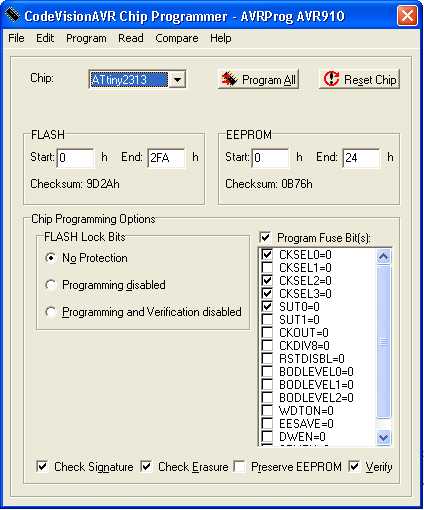 Фузы: МК настроен на работу от внутреннего RC-генератора на 4 МГц. CKSEL = 0010, SUT = 10, все остальные = 1.