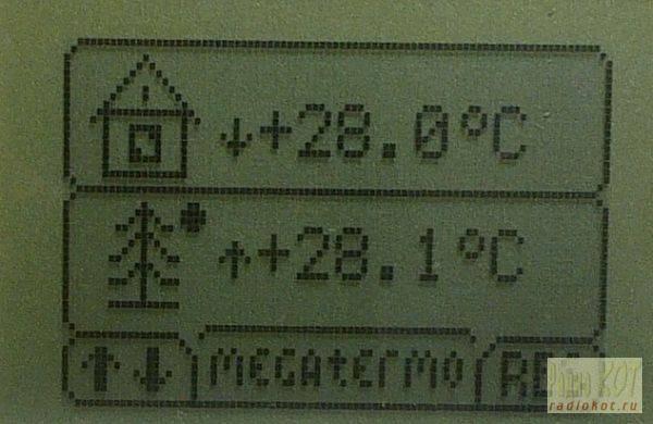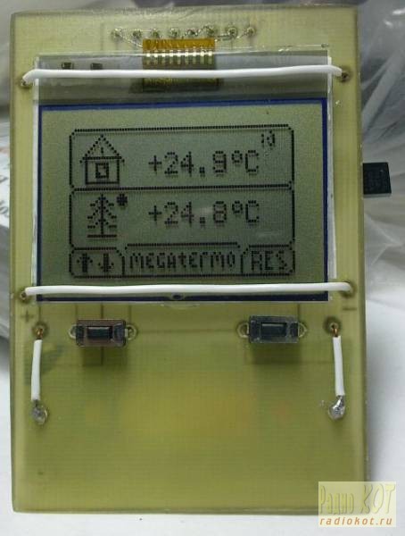 Левая кнопка - показать максимумы и минимумы, правая - сбросить максимумы и минимумы на текущие показания. Под дисплей я подложил отрезок листа белой бумаги - так картинка смотриться лучше. Справа виден датчик, который должен висеть на улице.