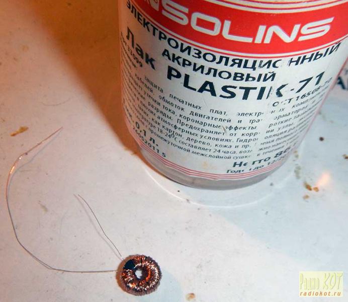 Теперь первичная обмотка. 16 витков проводом 0,3. Соблюдаем направление намотки. Снова всё пропитываем лаком и сушим.