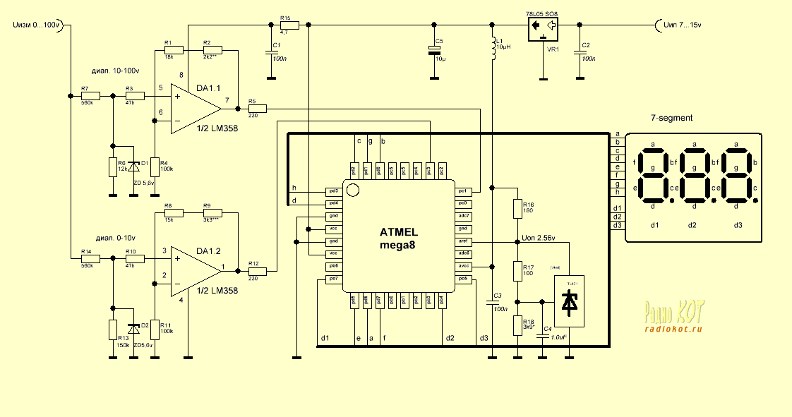 Собственно настройка сводится к установке образцового напряжения на ножке AREF контроллера или катоде TL431 равным 2.56в подбором резистора R18. Хочу отметить что эту процедуру нужно проводить без фанатизма, так как основная часть настройки будет дальше и важен порядок цифр. То есть опорное напряжение может быть в пределах 2.5...2.6в - ничего страшного, что не 2.56. После этого подбираем R2 для диапазона 100v и R9 для диапазона 10v до полного соответствия цифр на дисплее измеряемому напряжению. Увеличение номиналов увеличивает показания. Указанные на схеме номиналы - это то что получилось на моем экземпляре, и вероятность того что на Вашем экземпляре заработает все и сразу достаточно велика, по крайней мере я почти уверен что первый шаг с ИОН можно будет пропустить. Как я уже писал выше - точность показаний будет полностью зависеть от последнего шага - точности подбора резисторов.