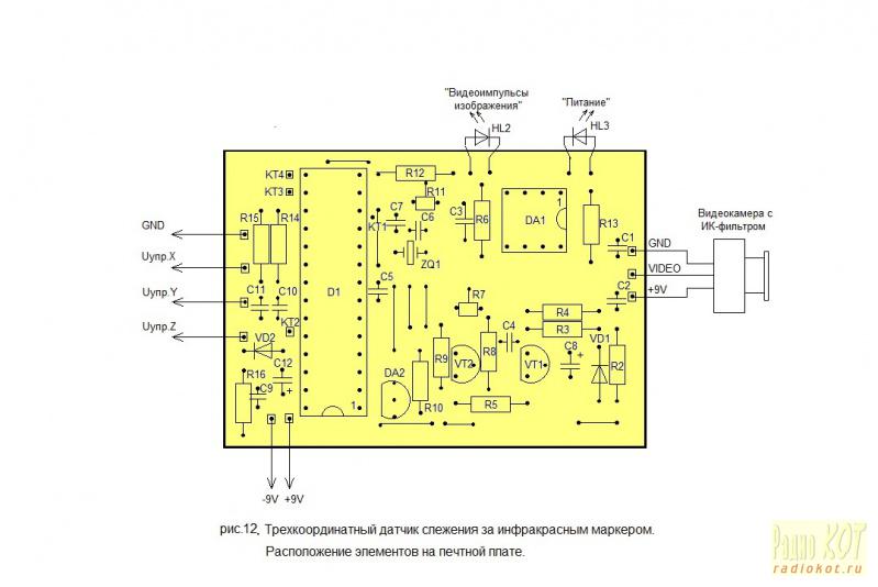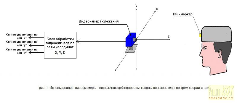 Автор: МКС, uels73@mail.ru В данном проекте предложена модель трехкоординатного датчика слежения за инфракрасным маркером. Принцип его работы заключается в том, что неподвижная инфракрасная видеокамера следит за перемещением в пространстве руки или головы человека по трем осям координат - X, Y и Z. Выделение объекта слежения (частей тела человека ) из общего фона осуществляется благодаря закрепленному на руке или голове пользователя инфракрасному светодиоду (ИК – маркеру), отличающемуся большей яркостью от окружающей обстановки (рис. 1). В результате на выходах электронной схемы блока обработки изображени я появляются сигналы, необходимые для определения положения объекта по трем осям координат. Используя эти сигналы через специальные адаптеры, можно управлять некоторыми функциями программ компьютера (играми, презентациями, графическими редакторами и т.д.) при помощи движений руки или поворотов головы пользователя. Аналогичные возможности появляются в вариантах подключения датчика к электронным устройствам с блоками приводов (включающих в себя силовые преобразователи и исполнительные двигатели), копирующих движение частей тела человека. Для изготовления этого датчика нам понадобится инфракрасный сенсор. В качестве сенсора используется монохромная черно-белая СMOS – видеокамера (рис.2). Такую модель можно купить во многих магазинах радиотоваров или салонах по продаже систем видеонаблюдения