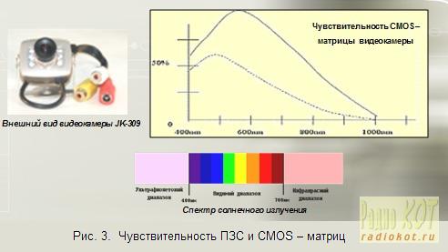 Дело в том, что видеокамеры с CMOS или ПЗС – матрицами чувствительны к видимому свету и к части инфракрасного излучения. Их максимальная чувствительность сосредоточена в видимом световом диапазоне длин волн - 400 нм…700 нм и расширенна в область инфракрасного света в диапазоне длин волн 700 нм…900 нм (рис. 3).