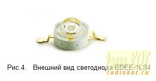 ИК – маркер состоит из последовательно соединенных инфракрасного светодиода HL1 и резистора R1 - ограничителя тока. С целью уменьшения габаритов ИК - излучателя и увеличения рабочей зоны можно применить мощный светодиод типа EDEF-1LS4 или ему аналогичный (рис.4). Он работает в инфракрасной области спектра и предназначены для использования в системах безопасности и видеонаблюдения. Такие светодиоды выпускаются в исполнении Emitter в стандартных для осветительных светодиодов корпусах диаметром 8 мм с диаграммой направленности по Ламберту. Они излучают свет в инфракрасном диапазоне 650 - 950 нм.
