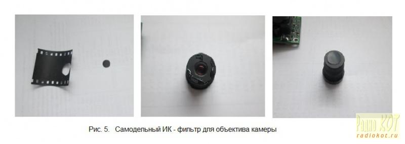 Инфракрасный светофильтр можно изготовить из старой засвеченной фотопленки, либо поэкспериментировать с окрашенным оргстеклом черного цвета. Также для создания фильтра можно использовать пластиковую основу CD - диска "черного" цвета (слой поликарбоната). На просвет она выглядит темно-вишневой или темно-красной. Из пластины выбранного материала вырезаем круг диаметром 5 - 7 мм и приклеиваем его к металлической рамке с внутренней стороны объектива (рис. 5). Т.е фильтр располагаем между матрицей и объективом. Затем, необходимо, подключить камеру ко входу «VIDEO»