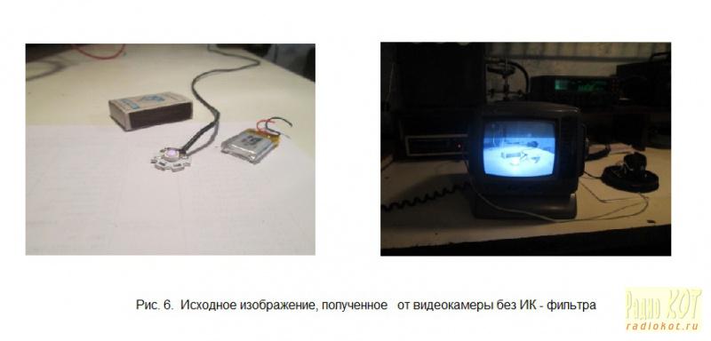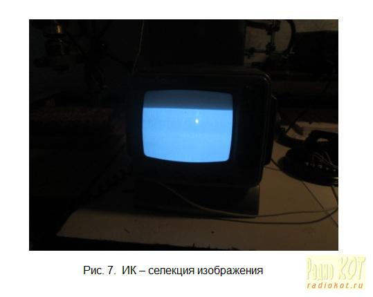 телевизора, расположить ИК – светодиод в зоне видимости камеры и по изображению на экране TV настроить фокусировку объектива. При этом фон окружающей обстановки, находящийся в видимой части спектра световых волн становится невидимым для камеры. Происходит ИК - селекция изображения (рис.6, рис.7).