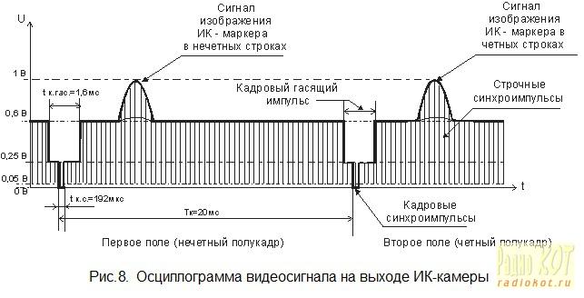 В зоне наблюдения матрицы камеры остается только световое пятно от инфракрасного светодиода. На выходе камеры наблюдается видеосигнал (рис.8), где в каждом полукадровом поле с синхроимпульсами, присутствует только сигнал изображения от ИК - светодиода маркера.