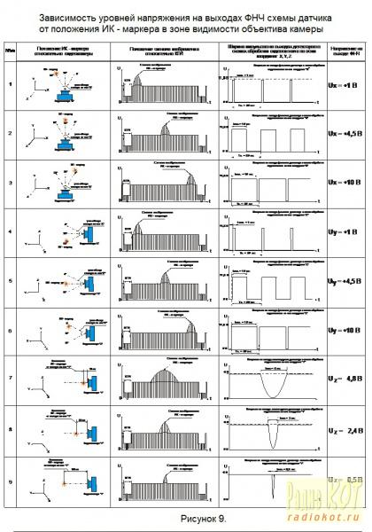 Если маркер перемещать относительно матрицы видеокамеры по вертикали (по оси - Y), то импульсы сигнала изображения «сдвигаются» по строкам в четных и нечетных полукадровых полях относительно кадровых гасящих синхроимпульсов видеосигнала (рис.9). При изменении положения маркера по горизонтали (по оси - X), видеоимпульсы от него смещаются по строке по отношению к спаду строчных синхроимпульсов. Приближение или удаление ИК - маркера, относительно объектива камеры, приводит к изменению размера проецируемого изображения (диаметра светящегося пятна) на матрицу. В этом случае количество видеоимпульсов изображения начинает изменяться в каждом поле четных и нечетных строк. Соответственно в схеме обработки сигналов изменяется ширина интегрированных видеоимпульсов и появляется возможность измерения положения объекта по оси координат – Z. Таким образом, измеряя положение и ширину видеоимпульса в каждом полукадровом поле и строках, можно простыми методами определять координаты объекта слежения по осям Х, Y и Z.