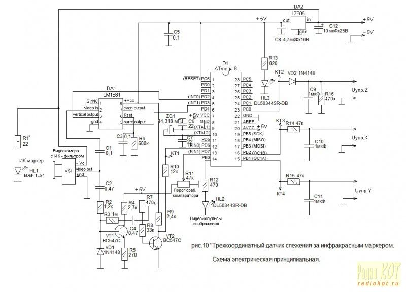 Электрическая принципиальная схема датчика приведена на рисунке 10. При появлении источника ИК - света в зоне видимости датчика, на выходе видеокамеры появляется позитивный видеосигнал синхроимпульсами вниз (рис. 8). Он поступает на вход видеоусилителя сигнала изображения выполненного на транзисторах VT1, VT2 Выделенные и усиленные видеоимпульсы сигнала изображения подаются на инвертирующий вход аналогового компаратора встроенного в микроконтроллер D1 АТmega8. Для этого задействован 6 бит порта D (AIN0). На втором (не инвертирующем) входе устанавливается порог срабатывания компаратора с помощью подстроечного резистора R11, подключенного к 7 биту порта D (AIN1).