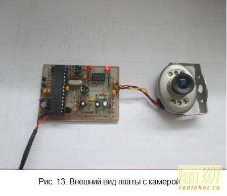 Плата с видеокамерой размещена в самодельном корпусе спаянного из пластин стеклотекстолита размерами: 55 × 75 × 105 мм (рис. 14). На передней панели корпуса, перед объективом камеры, наклеен дополнительный фильтр из красного оргстекла. Сам корпус датчика закреплен на пластмассовом штативе с платформой.