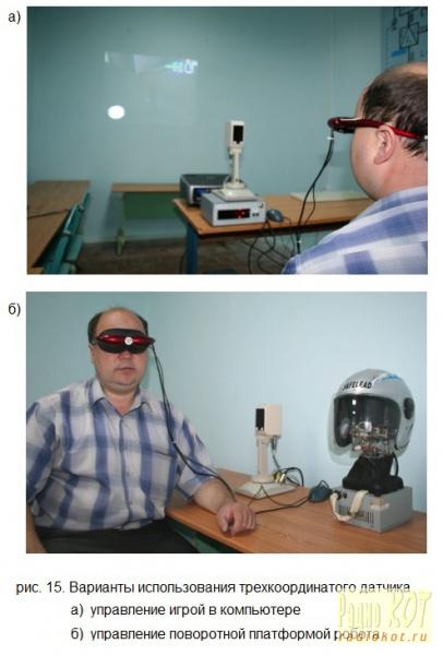Погружаясь в виртуальный мир, можно визуально воспринимать трехмерное стереоизображение. Пользователь естественным образом может осматривать изображение, представленное на дисплеях, вмонтированных в очки. При таком осмотре маркер на голове будет смещаться относительно датчика на столе. В результате угловых смещений головы человека датчик определяет координаты маркера в пространстве и направляет их в компьютер, а он в свою очередь изменяет угол обзора виртуального изображения. Область применения этого датчика не ограничивается, управлением компьютера. При помощи такого интерфейса можно управлять не только виртуальным миром компьютерных игр, но и реальными исполнительными механизмами с электроприводом. Например, в дополнение к этой работе была разработана и изготовлена система видеонаблюдения с подвижной платформой в виде шлема для робота (рис.16). Благодаря двум встроенным электродвигателям камера может изменять угол обзора по вертикали (вверх-вниз) и поворачиваться по горизонтали (влево - вправо).