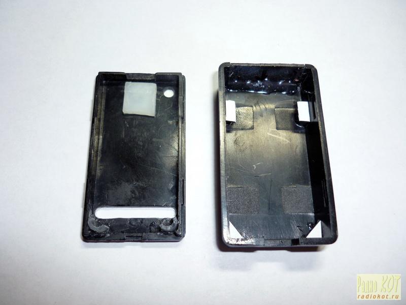 Корпус после доработки. Просверлено окошко для светодиода, прорезано отверстие для клемм, заклеено окошко сбоку, и наклеены стоечки для платы. Плата прижимается сверху крышкой.