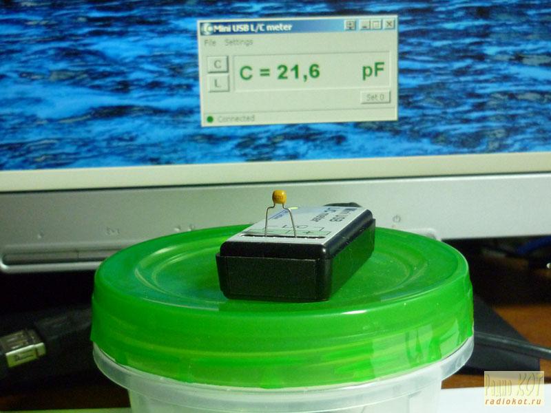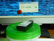 Процесс калибровки прибора очень прост. Для этого нам понадобится конденсатор с известной емкостью и перемычка - кусочек провода минимальной длины. Емкость может быть любой, но от точности примененного для калибровки конденсатора будет зависеть точность прибора. Я применил конденсатор K71-1, емкостью 0,0295µF, точностью ±0,5%.