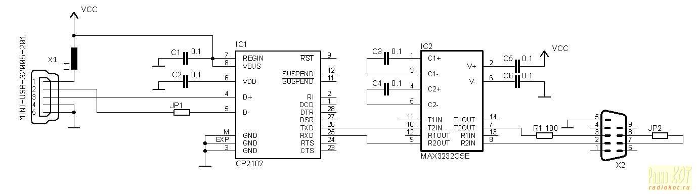 Следующим этапом стало изготовление переходника USB-RS232. На это меня сподвигли танцы с бубном вокруг моего рабочего компьютера, когда я пытался подключить к штатному СОМ порту контроллер Omron. На это было убито пол дня, измучена техподдержка Омрона, но в итоге выяснилось что это именно мой COM порт не хочет работать конкретно с Омроном. На другом компьютере контроллер подключился моментально, но на следующий день пришел хозяин компьютера и меня выгнал. Нашел у людей переходник USB-COM, но каждый день побираться не удобно, по этому появилось следующее изделие. Преобразователь USB-RS232 Была куплена та же микросхема CP2102 и MAX202. Ее отличие от типовой MAX232 в том, что в обвязке требуются меньшие конденсаторы по 0,1мкФ, а также она продавалась в узком корпусе, что для меня было удобнее. Дроссель имеет ту же функцию что и в предыдущей конструкции, резистор R1 на всякий случай - не люблю я подключать выходы на прямую на случай КЗ. Сборка заняла один вечер, при подключении все заработало сразу. Фото того что получилось ниже (качество поганое, как и фотоаппарат) :