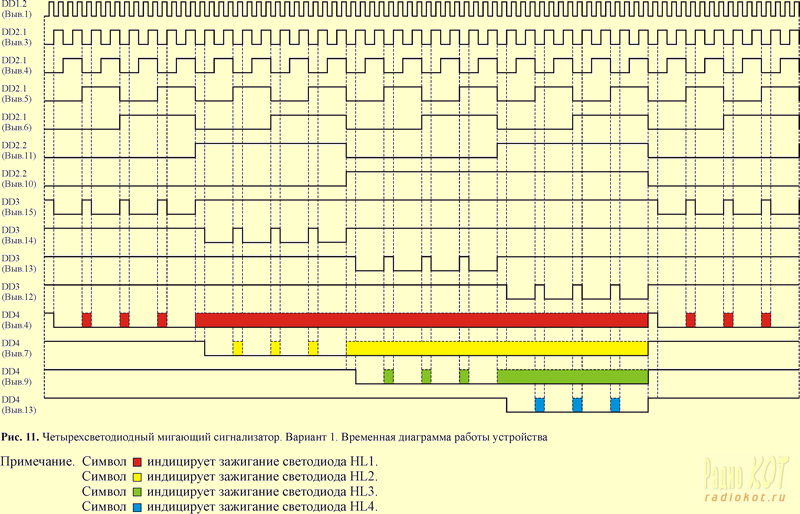Это означает, что переход RS-триггера в соответствующее состояние происходит по уровню логического «нуля», поступающему на соответствующий вход «R» или «S». При этом на указанных входах перед подачей активного уровня логического нуля должны быть предварительно зафиксированы уровни логических единиц. Такой режим работы обеспечивается с помощью дешифратора DD3, активные выходные логические уровни которого как раз и являются «нулевыми». В начальный момент времени, счетчики DD2.1 и DD2.2 находятся в «нулевом» состоянии, поэтому на выходе элемента DD1.3 формируется уровень логической единицы, который запрещает дешифрацию состояний счетчика DD2.2, выходные логические уровни которого поступают на адресные входы «1» и «2» дешифратора DD3. Таким образом, на всех его выходах формируются уровни логических единиц, что соответствует начальному состоянию устройства. Поскольку в конце предыдущего цикла на выходе элемента DD1.4 был сформирован короткий отрицательный импульс, все RS-триггеры были установлены в «единичное» состояние, поэтому все светодиоды погашены. При переходе счетчика DD2.1 из «нулевого» в «первое» состояние, уровнем логического нуля с выхода элемента DD1.3 разрешается дешифрация состояний DD3 и на его выходе «0» (вывод 15) появляется уровень логического «нуля». Этот уровень перебрасывает первый (верхний по схеме) RS-триггер, входящий в состав микросхемы DD4, в нулевое состояние, и, одновременно, поступает на анод светодиода HL1. Но зажигания светодиода в этот момент времени еще не происходит, поскольку разность потенциалов на его выводах равна нулю. При достижении счетчиком DD2.1 четвертого состояния, дешифрация состояний DD3 будет вновь запрещена, и на его выходе «0» (вывод 15) сформируется уровень логической единицы. Поскольку на выходе «1Q» (вывод 4) первого, по схеме, RS-триггера DD4 был сформирован уровень «нуля», это приведет к зажиганию светодиода HL1. Далее последуют три вспышки, со скважностью равной четырем, как и в предыдущих случаях, согласно временной диаграмме на рис 11 В данном случае, отрицательные импульсы на выходе «0» (вывод 15) дешифратора DD3 приводят именно к погасанию светодиода HL1, поэтому при переходе счетчика DD2.2 из нулевого в первое состояние, на указанном выходе «0» (вывод 15) дешифратора DD3 формируется фиксированный (статический) уровень логической единицы, и светодиод HL1 остается во включенном состоянии. Каждый последующий счетный импульс с выхода генератора приводит к увеличению состояний счетчика DD2.1 а, вслед за ним, и DD2.2. При этом происходят трехкратные последовательные вспышки светодиодов HL2…HL4 с последующей их фиксацией во включенном состоянии. При достижении счетчиком DD2.2 «четвертого» состояния, на его выходе «4» (вывод 9) формируется короткий положительный импульс, который, инвертируясь элементом DD1.4, приводит к установке всех RS-триггеров DD4 в «единичное» состояние и погасанию светодиодов. Далее цикл работы устройства полностью повторяется. Усовершенствованный вариант четырехсветодиодного индикатора приведен на рис. 13 В его состав введен простейший таймер, состоящий из генератора прямоугольных импульсов, собранного на элементах DD2.1, DD2.2, и счетчиков DD4.1, DD4.2. Таймер значительно расширяет функциональные возможности светодиодного индикатора и позволяет выбрать практически любую длительность цикла работы устройства, 
