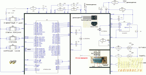 Версия V2, как я писал выше, больше промежуточная и имеет еще кнопки. Для версии прошивки 31 день есть двунаправленная связь с компьютером (RX-TX). Их было собрано больше всех – 9 штук. Схема немного сократилась в отличие от V1. Убрана оптопара, две кнопки и один светодиод. Схема: