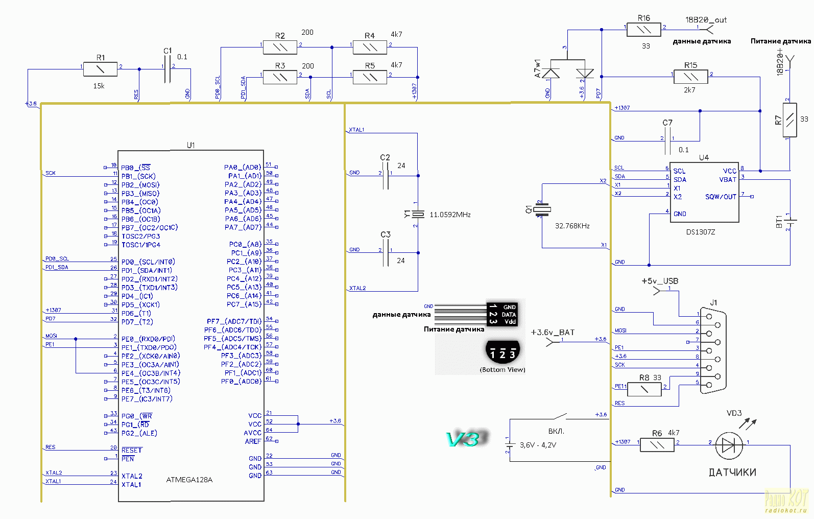 В данной версии также часы и термодатчик DS18B20 работают от батареи только в момент опроса. Остальное время они отключены. Алгоритм работы такой же как и V2. На 3D модели платы модель DB-9 не совпадает с реальной: