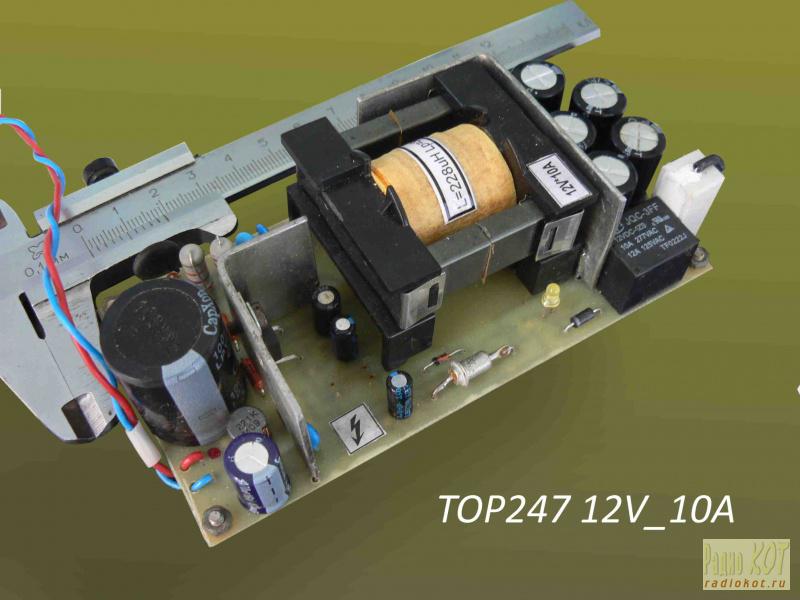 Сравнение габаритов блоков питания. 1. Классический 3Вт+импульсный стабилизатор. 2. Обратноходовой 28Вт+ стабилизатор тока. Габариты практически одинаковые. Мощ-ть в 10 раз больше. В 28Вт блоке питания были ограничения по высоте. Она получилась 21мм. Самой высокой деталью оказались радиаторы. До последнего времени импульсный блок питания был довольно сложной конструкцией и спроектировать и сделать его самодельщику было не так просто. Не хотелось тратить время и деньги на непредсказуемую конструкцию. Сегодня положение изменилось. Импульсный блок питания можно спроектировать и сделать с первой попытки не заботясь, что затратиш массу времени на расчет, настройку и покупку второго_третьего комплекта силовых элементов, после фейерверка на рабочем столе. Для изготовления импульсноых блоков питания в своих кострукциях я выбрал продукцию фирмы Power Integrations. Микросхемы для обратноходовых ИБП Причин несколько: - огромная номенклатура специализированных микросхем с верхней границей 250Вт - интеграция в одном корпусе силовых и управляющих элементов - встроенная, очень развитая защита практически на все нештатные ситуации - и самое главное, это фирменная, бесплатная очень удобная программа расчета на русском языке PI Expert . Скачать её можно свободно на сайте фирмы Power Integrations. На рассмотрении этой программы я остановлюсь более подробно. Почему именно она, а не другие программы расчетов? Программа расчитывает не только конструкцию импульсного трансформатора, а генерирует целый пакет документации. Вам не надо делать тепловые расчеты радиаторов силовых элементов, заботится о фазировке трансформатора, его заполнении обмоточным проводом, придумывать топологию платы, заботится о возможной замене применяемых компонентов имеющихся в наличии, выискивать в справочниках и даташитах параметры элементов. Все это есть на борту программы. Вы меняете компоненты,, программа проверяет реальную возможность ваших замен и в случае ошибки выдает предупреждение и рекомендации по устранению неправильных действий. Огромным плюсом является большая библиотека компонентов, начиная от контроллеров вторичного питания, активных компонентов и заканчивая резисторами. В библиотеку очень просто добывлять новые компонеты имея под руками даташит на них. Рассмотреть программу я хочу на конкретном примере. Это импульсный блок питания для настольной сверлилки. Описывать буду только основные моменты, так как программа большая и понятная. Те проблемы, которые встанут перед любителем при первом проектировании конструкции. Некоторые шаги проектирования я не буду рассматривать так как они понятны и логичны. Надо только один вечер посидеть за компом и просчитать одну конструкцию. Параметры проектируемого блока питания: Входное напряжение 180-265вольт. Выход 12вольт 10ампер. 120Вт. У меня имелся в запасе контроллер ТОР247, и сердечник с каркасом ETD39/20/13. Попробуем собрать блок питания на них. 1. После ввода основных входных параметров я получил вот такую картинку со схемой и кучей приложений. Меня не устраивает такое решение. Программа просчитала схему по экономической эффективности, но мне эту конструкцию массово не делать и нужны мои детали. Щелкаем мышкой по контроллеру и выбираем ТОР247. Судя по таблице, его применение возможно для этой мощности. Точно также можно заменить люб