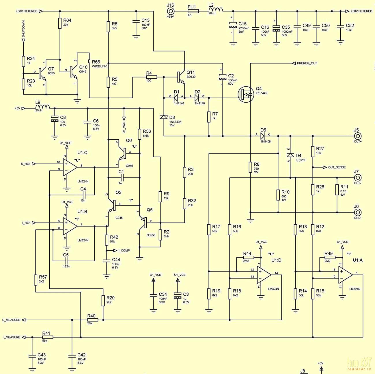 Отдельно взятый импульсный стабилизатор, напротив, не может обеспечить быструю реакцию на ограничение тока, так как частью выходного фильтра является конденсатор большой емкости. Используя предрегулятор, выдающий напряжение на 1.2В выше требуемого, мы не рассеиваем энергию в тепло, а на транзисторе линейного регулятора выделяется так мало энергии, что он может работать с минимальным радиатором даже на 3А. За основу схемы линейного регулятора взята часть схемы блока питания под авторством Koyodza. Все её преимущества описаны в статье [2.12]. Мне она понравилась за простоту и стабильность работы при ограничении тока.