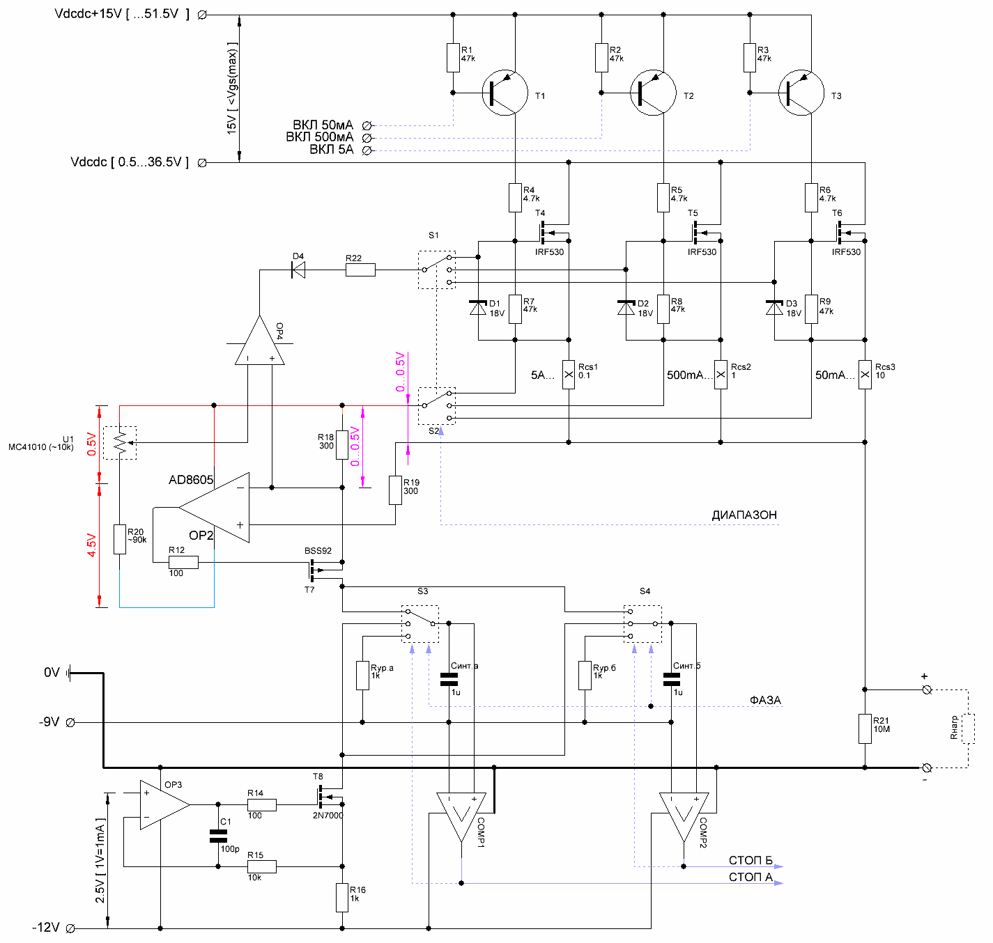 Собственно, вопросы: 1. (самый главный ) - имеет ли право на жизнь такая схема? (пока существенных возражений не поступило - ФНЧ не подходит) 2. на каких компонентах лучше собрать: - коммутацию сигнала управления токоограничивающего ОУ к затворам полевиков (S1 на схеме); - коммутацию потенциала истока выбранного регулирующего полевика к инвертирующему входу ОУ датчика тока (S2 на схеме); - (выбор диапазона предполагается до подключения нагрузки, когда на нагрузку подано напряжение диапазон меняться не будет - т.е. грубо говоря всё в ручном режиме); - коммутацию входа к интегрирующим кондёрам (S3/S4 на схеме) - изначально думал взять CD74HC4066, но смущает ограничение на 0.6V дифференциального напряжения между входом и выходом ключей (из датащей, получается до 0.6В / Rds=95Ом(макс) ~6мА лимит на ток в худшем случае). может что-нибудь вроде КР590КНхх ? по описаниям там до 20мА, но документация скудная и опыта с ними нет. 3. т.к. доступные прецизионные ОУ пока нашёл только CMOS, а у них ограничение по питанию обычно 2.7-5.5V, получается что придётся запитывать от потенциала равного потенциалу на истоке выбранного полевика. как это лучше реализовать с учётом того, что в случае регуляции по току потенциал этот будет гулять относительно земли? (боюсь спалить этот ОУ)) - красный и синий проводники на схеме