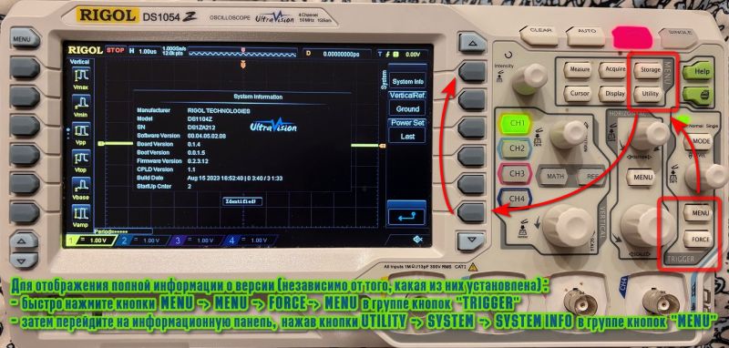 Чтобы отобразить полную информацию о версии (независимо от того, какая версия установлена): - быстро нажмите кнопки MENU -> MENU -> FORCE -> MENU в группе кнопок «TRIGGER» - затем перейдите на информационную панель, нажав кнопки UTILITY -> SYSTEM -> SYSTEM INFO в группе кнопок «MENU»: