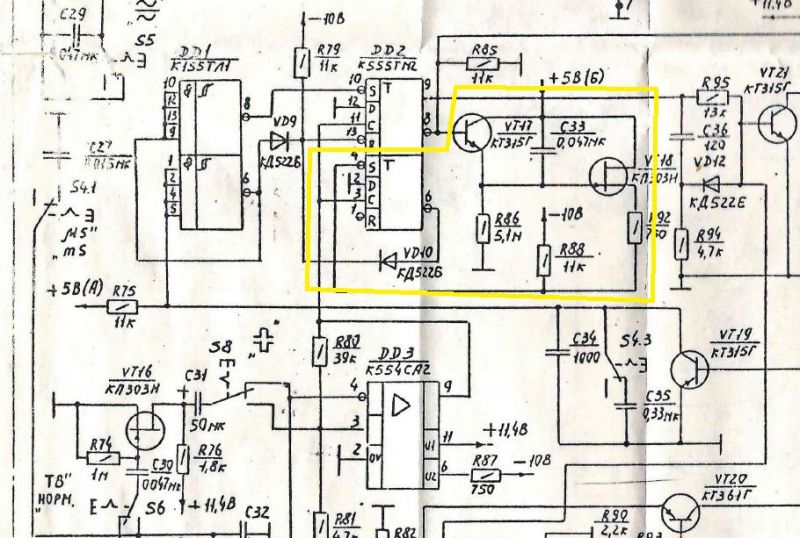 Известная схема от С1-94 v3. Она же Сага, она же ОР-1 . Я ужасно извиняюсь. Помогите, пожалуйста ,понять назначение этого узла в развертке. Второй триггер и два транзистора. Понятно, что это формирователь каких то "иголок" для входа S второго триггера. Эти иголки настолько тонкие, что осциллограф их не видит. На эмиттере их еще видит "цифровая ловушка", но на стоке и на входе S ловушка уже их не фиксирует. Или они столь короткие или кп303 на них не реагирует. Да и сам формирователь мягко говоря странный - зачем задействовано -12v посреди ттл? Может это рудимент от С1-94 первой версии? В среде ттл короткие импульсы можно сформировать - может в те времена корпуса экономили..