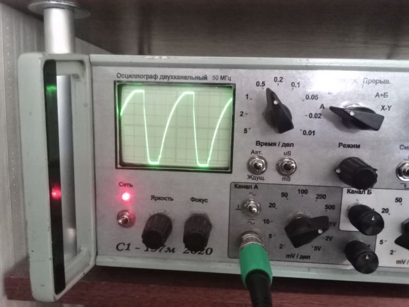 Вот такая штука на выходе пока. Щуп 10:1, так что размах около 35 Вольт: