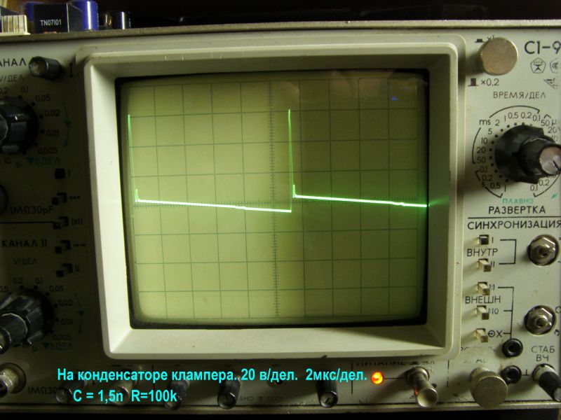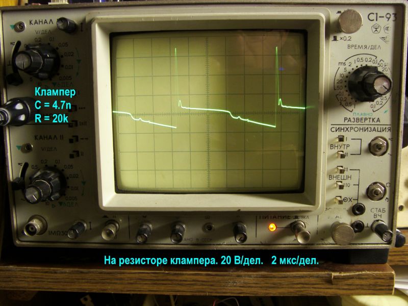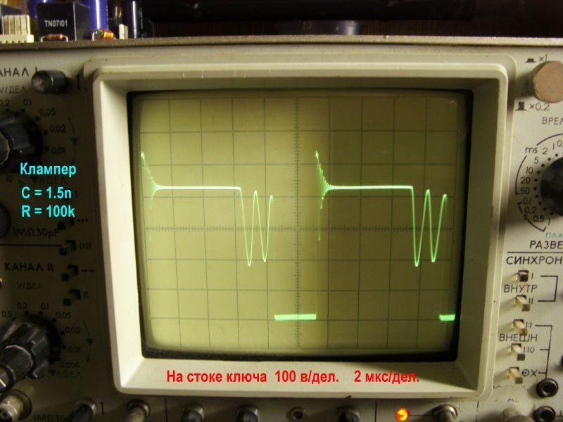 Здравствуйте, уважаемые! Второй раз собираю ИИП, раньше как-то обходился трансформаторными блоками. Делать маломощные, это еще приемлемо, но блоки более 20 Вт на 50 Гц трансформаторах, совсем уж неприлично выглядят. Понадобился мне 100 Вт ИИП и я решился собрать импульсную схему. Первый для пробы, был 12 Вт на TOP245. Вроде получился. Начал делать на ТОР258 100 ватт. Собрал я такой блок, он запустился, но больше 1А, не выдавал. Пляски с бубном не помогли. Из купленных 7 штук TOP258 больше ни одна микросхема не запустилась. Собрал тестовую схему, для их проверки, из даташита - все мертвые, даже не дергались, как будто в корпусе нет кристалла. Видимо попал я на какую-то подделку. Плюнул я на топсвичи и к ним из за большого количества подделок, возвращаться не буду. Собрал теперь классическую схему на UC3842 с TL431. Блок запустился с первого раза. Нагрузку тоже держит хорошо. Нагрев радиаторов, транса и элементов клампера вроде в норме, т.е. не превышает 65 град при полной нагрузке. Опыта в настройках клампера для таких импульсников у меня пока нет, по этому я для первого запуска взял номиналы клампера, который мне выдал PIExpert. Потом, глядя на осциллограммы, я попытался рассчитать номиналы клампера, но что-то гложут меня сомнения, правильно ли. Трансформатор намотан на ETD34 по программе Старичка, дай Бог ему здоровья. Частоту преобразования в программу вставлял из того, что получилось в реальности. Фотки осциллограмм и расчет транса прилагаю ниже. Первый вариант клампера C=4.7n R=20k, во втором варианте (после расчета) С=1.5n R=100k На фотках это подписано. Посмотрите пожалуйста, какие осциллограммы лучше, а может оба варианта плохие и еще что-то менять надо.