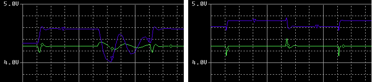 Слева: 10 кОм + 200 Ом, справа: 100 Ом + 20 Ом Синяя линия - исток регулирующего транзистора. Зеленая линия - выход источника.