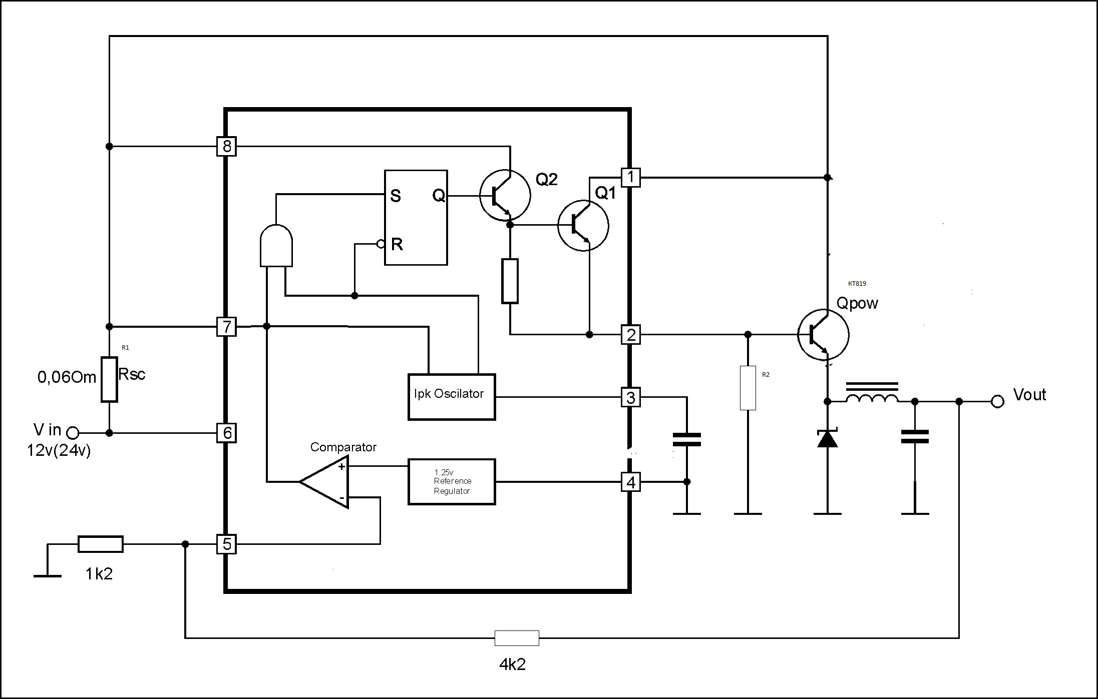 Доброго времени суток! Помогите расчитать резистор для базы транзистора в ШИМ . Модулятор собран на мс 34063 по схеме с внешним транзистором из даташита. транзистор поставил КТ817Б hfe у него 25 питание схемы 12-14 В ток нужен, к примеру, 1А на выходе . По моим расчетам:
