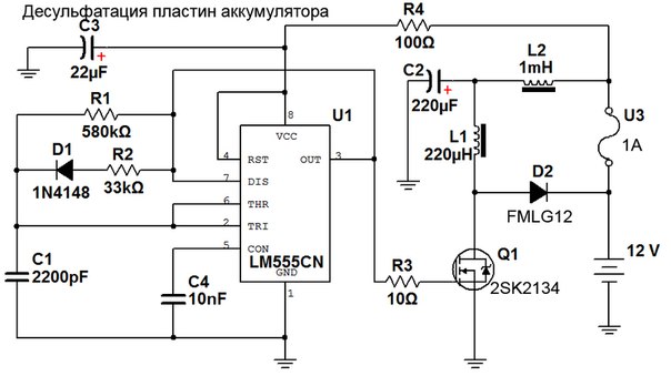 Сам мучал автомобильный АКБ пищалкой с самопитанием по схеме аналогичной схемам http://www.russianelectronics.ru/files/47280/Image1.gif download/file.php?mode=view&id=175365 download/file.php?id=281450 Дроссельки использовал покупные у китайцев на гантельках и на кольцах (как самомотанные так и покупные).На феритовых кольцах если и мотать то надо обязательно или пилить зазор или ломать и клеить, иначе входит в насыщение и греется транзистор и сами дросселя. Лучший результат был с дросселями на гантельках. Транзистор надо использовать с наименьшим сопротивлением сток-исток. Максимальныйе импульсы которые мне удавалось получить 1В (на автомобильном АКБ) и ток ампер 10, но не на долго, все равно дросселя грелись до отпаивания. В обвязке 555 таймера резистор который задает заполнение импульса ставить подстроечный, и им ловить момент когда начинает нагреваться дроссель и резко возрастает ток потребления всех приблуды. Месяц использования этой схемы на автомобильной кальциевой АКБ ничего не дал, умощнять схему не вижу смысла, там дросселя надо мотать очень мощные чтоб толк был, а будет он для автомобильного АКБ на токах в 100 а может и больше ампер. Начинал ваять вот эту схему http://www.eurosamodelki.ru/uploads/ima ... 5e35166138, но там трансформатор мотать надо, намотал - не получилось как надо, очень качественно мотать надо, а у меня с этим траблы. Буду ваять вот эту схему как тиристор найду download/file.php?id=277614 (ВНИМАНИЕ, нет галяванической развязки с сетью, включенную в сеть руками ничего не трогать)