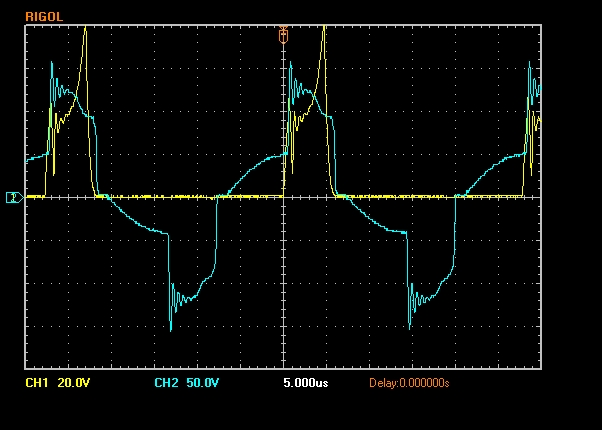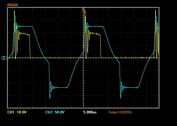 ты же видишь, что он быстро насыщается - на зеленом канале идет падение амплитуды напряжения, а на желтом канале видим огромный всплеск тока.