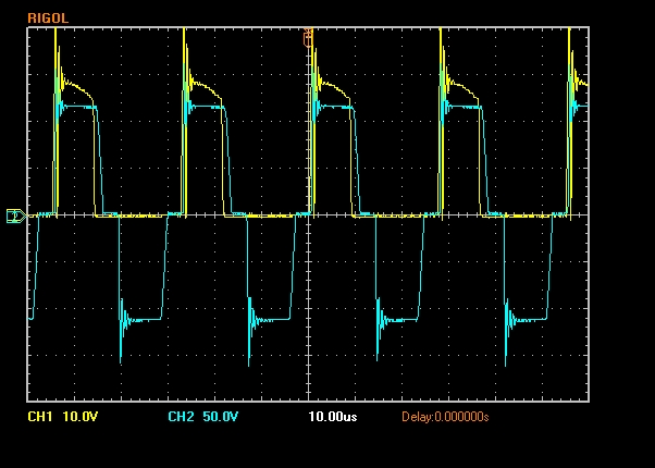 Комментарий к файлу: Дроссель на ферите 10, 6 и 6 Витков. Нагрузка 270Ом В канале 140В. желтый канал - сограсующий трансформатор со стороны 494. Зеленый канал - вторичка 80В на трансе.