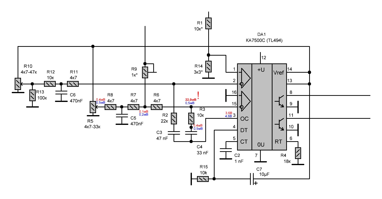 Доброе время суток! Вопрос "со звёздочкой". Вернулся ко мне полуторагодовалый переделанный в ЗУ блок. Ни с того, ни с сего вылетели силовые ключи (13009). Я блок отремонтировал, с пристрастием протестировал - все работает. А вот причина осталась для меня загадкой. Но выяснилось одно НО. В этом блоке ток не ограничивается до "0" (на ВАметре -0,07А). Естественно, на ХХ, если выкрутить ток на минимум-напряжение не снижается. Под рукой другая переделка - там напряжение снижается. В обеих блоках родная низковольтная часть полностью убрана и сделана отдельная плата ШИМ. Низковольтные части на обеих блоках абсолютно одинаковые (разнятся только горячие). На картинке промеры напряжений в проблемной части (красные -"плохой", синие -"хороший") В некоторых точках возможно цифры разнятся за счет округления, т.к. мерял на пределе 600мВ. Сам вопрос. Можно ли сказать, что это проблемная TL494 и могло ли это послужить причиной вылета ключей?