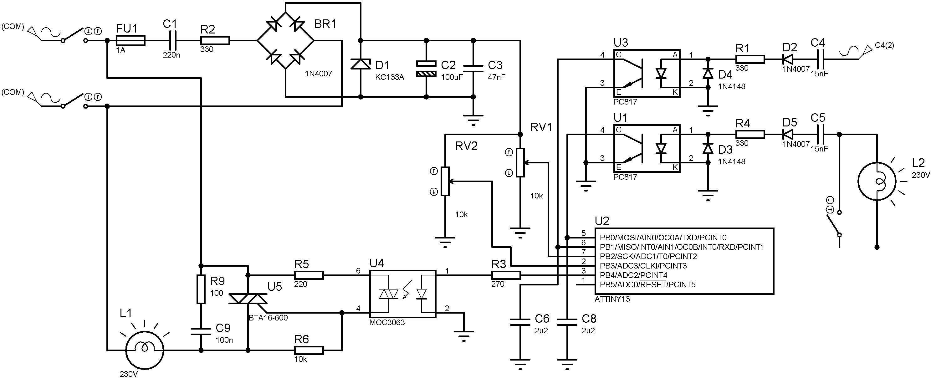 от U4 - тоже легко избавиться, для этого надо избавиться от моста в балластном питателе (прийдется увеличить емкость С1 вдвое) и тогда можно будет землю MCU соеденить с ближним к управляющему силовым терминалом триака. (нагрузку естественно через дальний терминал)