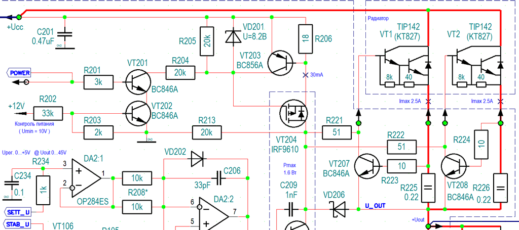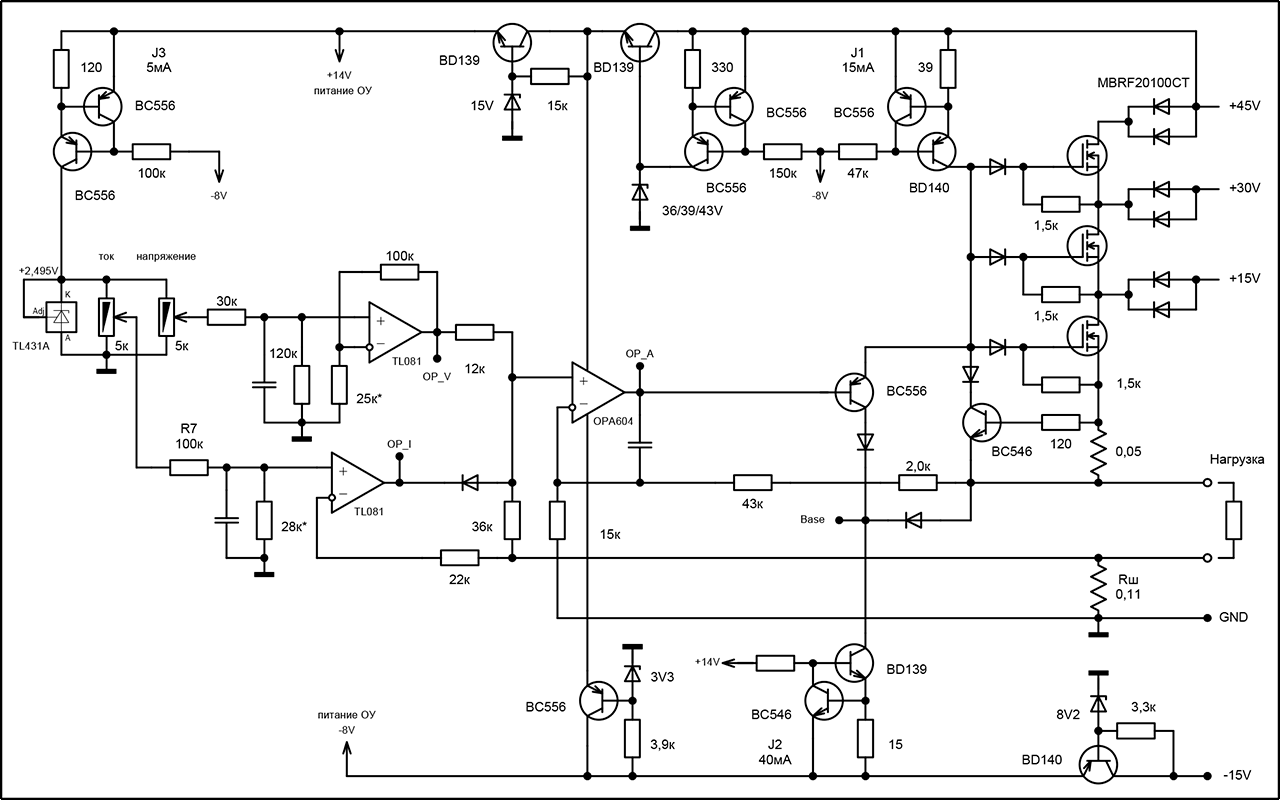Не понял, это о чем? Где там еще "пред стабы."? Пульсации на конденсаторах должен сглаживать сам стабилизатор, многоуровневый он, или одноуровневый, это его назначение. А схема от Slabovik с прошлой страницы мне понравилась, вот и подумал, еще немного и получится то, что я хотел. Выход с регулирующего ОУ на быстрый транзистор по схеме ОЭ и со стабильной нагрузкой, а далее повторитель напряжения для увеличения выходного тока. Ведь именно это и напомнило старую и проверенную годами схему. Да и на выходе у нее никаких электролитов, вроде ставил керамику 0.1мкФ, работает без возбуждений, КЗ вообще не боится, светодиоды проверять можно.