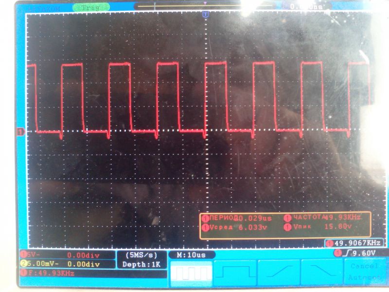 Сделал осциллограммы сигналов. При нагрузке в 5 ом, ток 5 а, сильно разогрелись ключи. Под нагрузкой на стоке наблюдается изменения частоты 50-150 кГц.