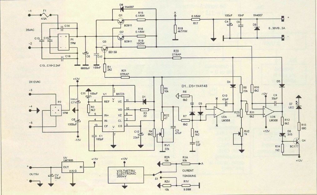 Не стоит 1. 723 питается от источника +12. В действителности будет +17. Снижаем на три Ubэ 17-2,1 = 15V - максимальное выходное 15V 2. 358 питается от источника +12 - по схеме. На выходе +30 (по схеме) На вход -(минус) U2b через R10 автор умудрился подать +30. Хорошо что БП не может дать их. Вход + - лучше, через делитель. 3. Относно STRAP должно описано в тексте к схеме.