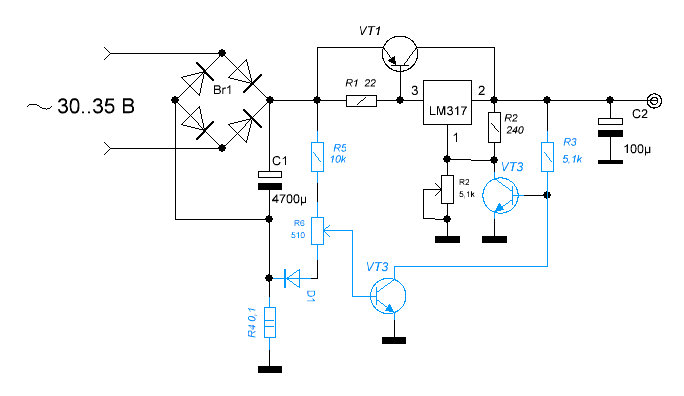 RadioWolf - Требования: 0-30В, 5А Во-первых, получение регулировки "от нуля" требует введения специальных мер по компенсации начальных напряжений. Во-вторых, при таком желаемом токе регулятор VT1 будет рассеивать на минимальном напряжении в атмосферу порядка 35В * 5А = 175 ватт. Так что либо осетра урежьте, либо запасайтесь огромным трансформатором и радиатором с хорошим ветродуем, также BDX33C в качестве регулятора не подойдёт (можно поставить три штуки впараллель, либо отказаться от идеи стабилизации "от нуля"). Защита от перегрузки по току будет мешать нормальной работе стабилизатора, напряжение будет плавать, а шунт будет рассеивать дополнительные четыре ватта на максимальном токе. Посмотрите схему Б5-44А - в качестве примера не самого плохого линейного стабилизатора на рассыпухе, просто для сравнения с вашей "схемой". Рекомендую также глянуть на схему источника питания "Марс", он же "ИПС-1" - минималистичный стабилизатор с неплохими параметрами, который можно попробовать масштабировать под ваши хотелки с учётом вышесказанного. Он также собран на рассыпухе.