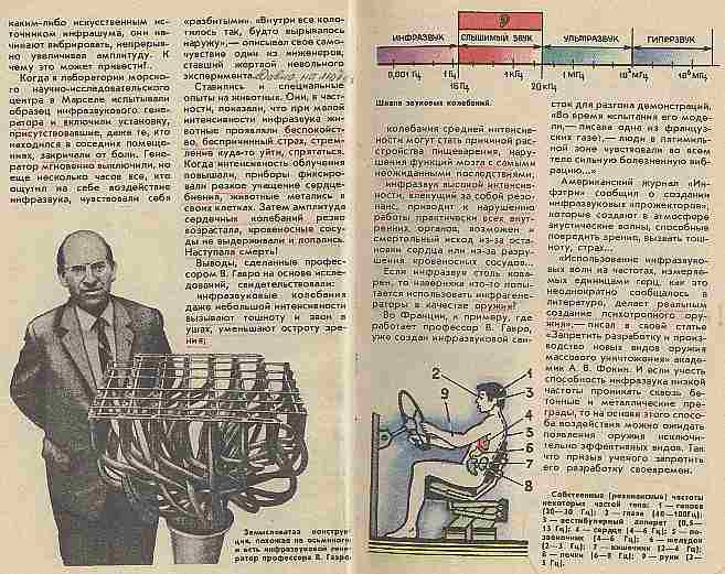 Скачал Psyho generator v0.2, врубил на 7 герц - усилитель на полную врубил, ничего неслышу, но состояние не приятное Дрожит поджелудочная, дыхание сбивается, серцебиение пока нормальное, головокружение, подташнивает, рыбы в аквариуме о стенки аквариума бьются - словно выпрыгнуть хотят. Колонки у меня прикручены к стенам друг напротив друга. Если подставить ухо, немного слышно как ходит воздух. Такое впечатление, что как в самолёте уши закладывает и тут-же отпускает - может это оно и есть???