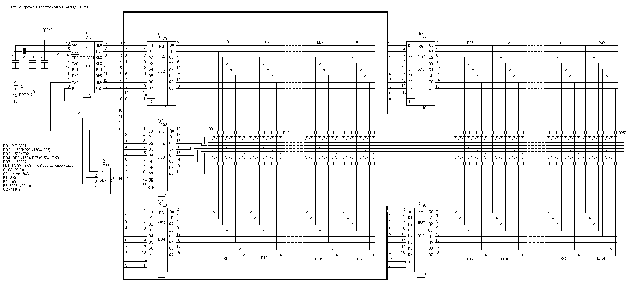 Вот сваял простенькую схемку управления матрицей светодиодов 16х16 пиком PIC16F84. Перед просмотром, замените расширение doc на bmp. Может кому пригодится)).