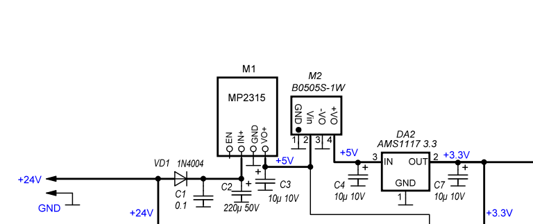 Вот схема есть где 24 вольт и с фильтром на 5в. Так же может вместо стабов. использовать схему с переключением на нужное выходное напряжение.