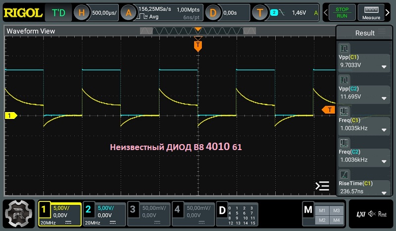 И дай думаю посмотрю сигнал после него на осциллографе. Попробовал этот В8 4010 61 и 1N5819. Оба Шоттки и на обеих падение одинаково 200мВ. Но почему-то на диоде 1N5819 амплитуда падает в три раза, а на неизвестном в два.