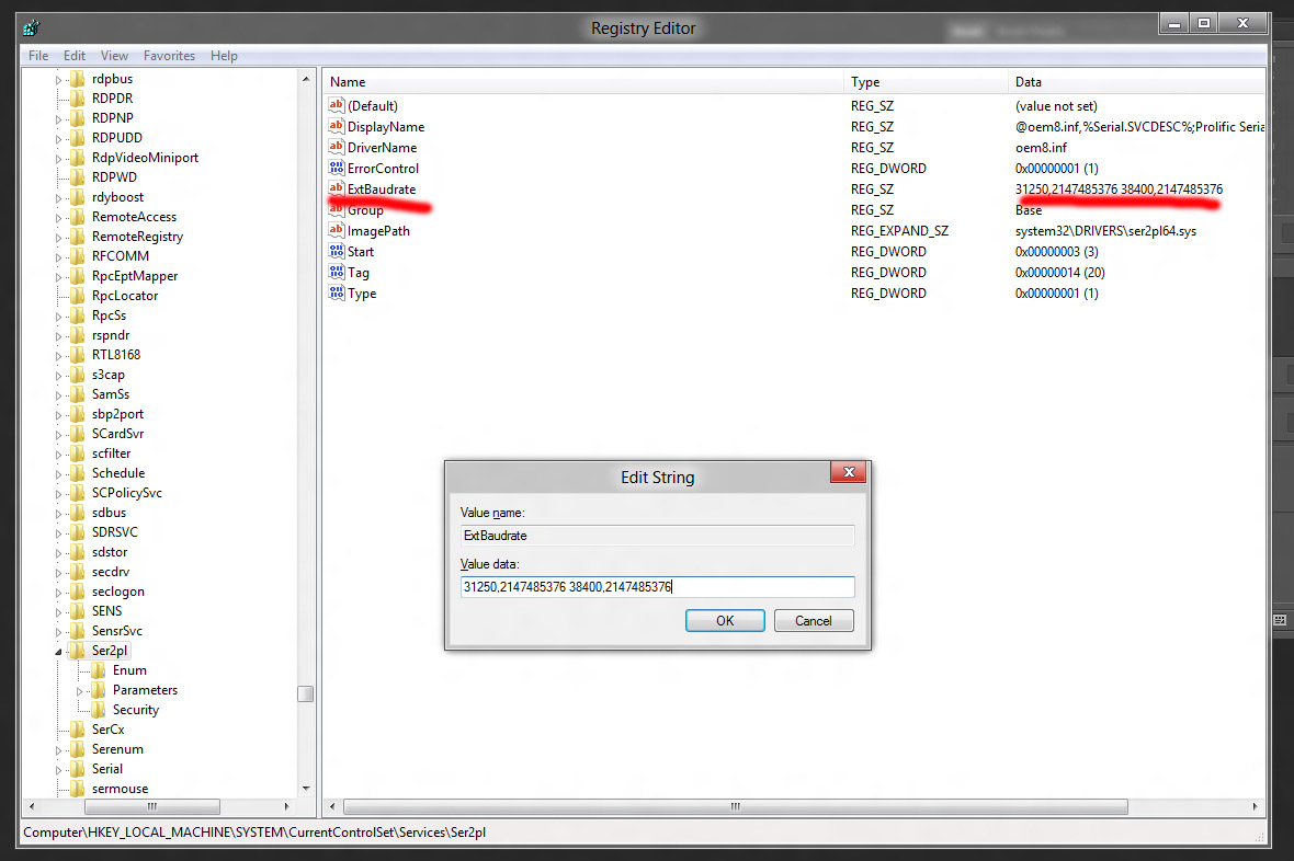 Чтобы добавить в реестр запись для включение драйвером нужной скорости для PL-2303, необходимо нажать клавишу с символом Виндовс и R (Win+R), откроется окно "Выполнить", в нем набрать regedit, нажать Enter. В появившемся окне редактора реестра находите HKEY_LOCAL_MACHINE далее SYSTEM и т.д. согласно пути HKEY_LOCAL_MACHINE\SYSTEM\CurrentControlSet\Services\Ser2pl Добравшись до папки Ser2pl в правом окошке находите значение ExtBaudrate и присваиваете ему значение
