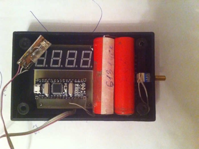 Представляю вниманию цифровой измеритель оборотов двигателя на ардуино нано 328 Измеряет обороты от 50 до 9999 об/мин и выводит значение каждую секунду на индикатор. Для работы необходимо наклеить кусочек алюминиевой фольги на темный ротор или черной изоленты на светлый. После включения прибор проверяет уровень отраженного сигнала в течение минуты. и дает значение от 0 до 1024 - пороги настроены на более 800 и менее 200. По ощущениям погрешность в пределах 0,5%. Схема: Фотоэлементы: L-34F3C ик диод 20мВт L-3DP3C фототранзистор Фото прототипа (неказисто, конечно, но работает): Показывает уровень темного: Кому как, а кота заинтересовало: Ну и прошивочка: