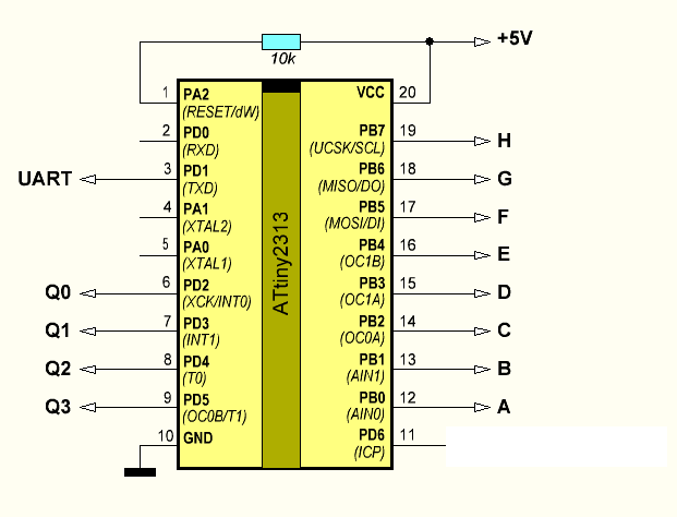 МК (тини2313) тактируется на частоте 4 МГц. Подключив управление для индикатора к выводам ABCDEFGH на выводах Q0…Q3 получим двоичный код соответствующей цифре. Так же информация о текущей цифре передаётся по UART (9600, 8 Data, 1 stop bit, Disabled ). Некоторые МК без кварца выдают по UART не то что отправляется… с кварцем таких проблем не замечено.