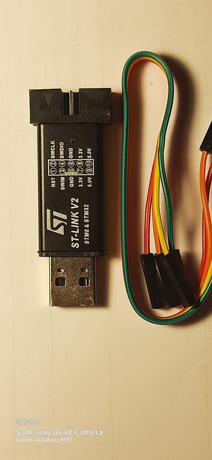 Заказал на Озоне новый МК, обещали к 1 апреля Программатор USBasp, куплен на Озоне в комплекте с тем битым кабелем, о котором писал выше. Фото программатора и своей платы прилагаю, по ним можно посмотреть распиновку. Я правильно понимаю, что контакт MOSI программатора должен соединяться с MOSI МК? Или наоборот, MOSI с MISO? Есть ещё программатор ST-Link V2 (см. фото), но у него совсем другая распиновка и наименование контактов разъёма. Как я понимаю, он для других контроллеров, серии STM. Можно ли им программировать ATtiny2313 ?
