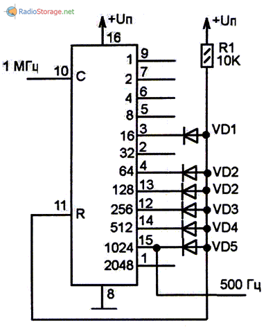 ААА! Я понял! Счётчик четырнадцатиразрядный, но не со всех разрядов сделаны выходы наружу корпуса микросхемы! Значит её максимальный коэффициент деления равен 16384 ? А если я на вход левого счётчика подам 32768 Гц, то на его выходе (ножке 2) будет 4 Гц ? А на выводе 2 правого счётчика будет 2 Гц?