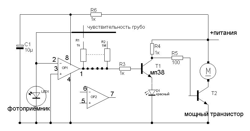 для светодиода, а для моторчика надо что-то мощнее.Не знаю, что у Вас есть, поэтому пока не советую.Можно регулировать чувствительность схемы, переключая постоянные резисторы Р1 и Р2, или поставить переменный до 100ком.Микросхема работоспособна до напряжения 30 вольт при однополярном питании. Рекомендую эксперименты проводить при питании не более12 вольт, дабы не спалить элементы. Р6 и С1-фильтруют питание для удаления помех от работы двигателя.На первое время- добейтесь "загорания" светодиода, потом переходите к моторчику.